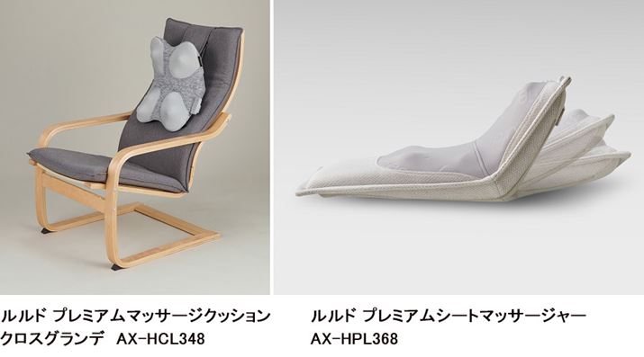 「ルルド」と聞いてピンと来た方は、おそらくロングセラー商品である、見た目がクッションの本格マッサージャー「ルルド マッサージクッション」をイメージされていることでしょう。この「ルルド マッサージクッション」は2009年の登場以来たびたびバージョンアップが行われており、2021年には、“くの字型のサスペンション構造”を搭載したマッサージクッション「ルルド プレミアムマッサージクッションクロスグランデ AX-HCL348」をリリース(下の画像左参照)。体重をかけるとクッション全体が広がるようになっており、肩やお尻がフィットしやすくなりました。