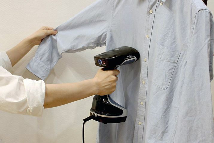 ・ポリエステル65%・綿35%のシャツ【満足度:★★☆】スーツにあわせるなどビジネスシーンでピシッと着こなすことが多い、ポリエステルと綿の混紡素材のシャツは、衣類スチーマーよりも、上からプレスできる普通のアイロンのほうが適しているように思いますが……実際に試してみたところ、目立ったシワを取ることができました。深いシワはうっすらと痕跡が残りましたが、ジャケットを羽織れば目立たない程度。なお、生地が薄いため、シャツの後ろにあるものも湿りやすくなります(それだけスチーム量が多いってことかも!)。気になる方は、カーテンや壁などがない場所で使うほうがいいでしょう。