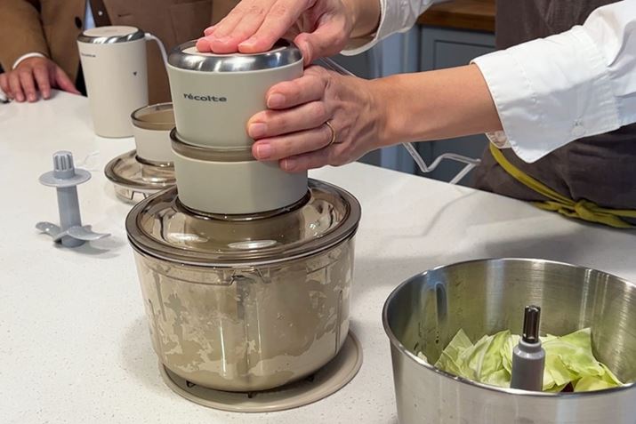 体験会では、「コンボ」の特徴を生かした調理が実演されました。餃子の餡だけでなく、皮も「コンボ」で作ります!