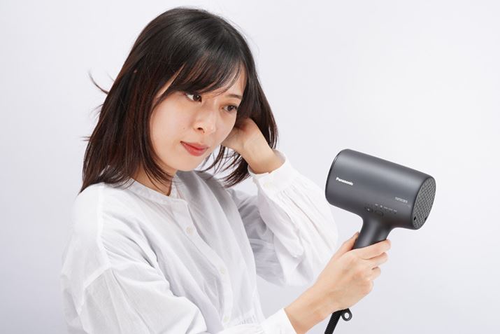 筆者は少し前までロングヘアだったこともあり、ヘアドライヤーを選ぶ際の必須条件は「大風量」でした。短時間で髪を乾かせるので特に不満なく使っていましたが、今回、小型化した「EH-NA0J」を使って、小さいことのメリットを実感。腕への負担が少なく、取り回しもしやすい。それでいて、筆者所有のヘアドライヤーと変わらないくらいの時間で髪が乾くうえ、髪がまとまってツルンとした手触りに仕上がるのですから、本気で買い替えたい気持ちになりました。