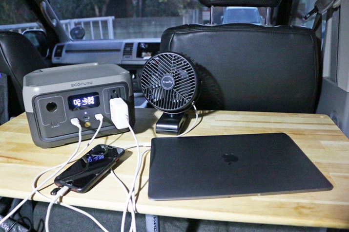 筆者は、仕事で車中泊をすることがあり、その際、車内でパソコンを使って仕事をしている。近年はAC100Vで給電できる機能を持った自動車も増えているが、基本的にエンジンをかけなければならない。全国的にアイドリングストップ条例の制定が広がっていることもあり、エンジンをかけずに電化製品を使用するにはポータブル電源が必要になる。ただ、「RIVER 2」は容量256Wh、出力300Wなので、電気ケトルやオーブントースターを使えるほどのパワーはない。一部の炊飯器やミキサー、ポータブル冷蔵庫など300W以下で稼働する電化製品はあるが、筆者はスマートフォンの充電、ノートパソコンや扇風機、電気毛布の電源として使用できれば十分だ。