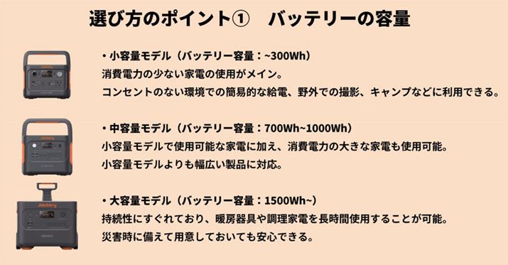 ポータブル電源を選ぶ際は、まずは用途に合ったバッテリー容量のモデルを選びましょう。ポータブル電源はバッテリー容量が大きくなるほど、家電を長く使えたり、消費電力の大きな家電が使えたりします。ただし、その分本体サイズが大きく重くなり、持ち運びが大変になり、収納時の場所も取ります。さらに、価格も高くなるので、自分に合った容量のモデルを選ぶのが重要です。