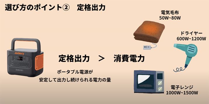 ポータブル電源に接続して利用したい電気製品の「消費電力(W)」の確認もしておきましょう。消費電力は、どのくらい電気を消費するかを示したものです。家庭向けの電気製品には、消費電力の表示が義務づけられているので、製品のどこかに表示があるはずです。たとえば、電気毛布は50〜80W、ドライヤーは600〜1200W、電子レンジは1000〜1500Wが目安。
