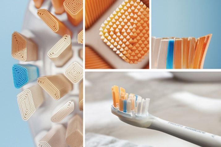 高速の振動、音波の水流と合わせて歯垢除去力を高めているのが、付属の「プレミアムオールインワンブラシ」。元々ソニッケアーはユーザーの悩みに合わせて、さまざまな種類の替えブラシを展開していますが、このブラシヘッドは1本で「歯垢除去」「ステイン除去」「歯ぐきケア」の3つのニーズにアプローチするすぐれもの。角度の付いたブラシは、あらゆる角度から歯垢に届き、ドライアングルにカットされた毛先が歯の着色汚れを落とす。そして、サイドの毛が歯肉をブラッシングすることで歯ぐきをケアします。