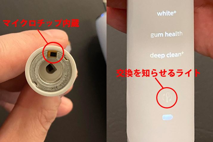 そして使い続けていく中で便利なのが、「ブラシヘッド交換お知らせ」機能。ブラシヘッドにマイクロチップが内蔵され、ブラッシング時間とブラシ圧を記録して、交換時期になるとハンドル下部にあるライトが光って、ブラシヘッドの交換タイミングを知らせてくれるものです。なかなか自分では判断しづらい交換時期ですが、適切なタイミングでブラシヘッドを新しくできるので、高い歯垢除去力をキープしたまま使い続けられます。