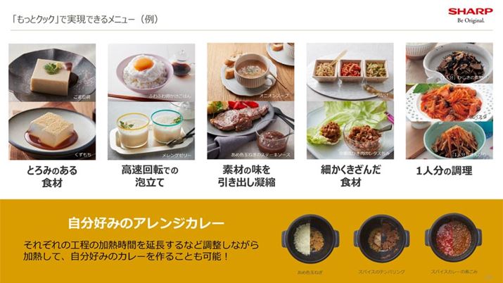 また、「もっとクック」に対応した自動調理メニューはプリインストールされていないため、クラウドサービス「COCORO KITCHEN」のメニューを本体に送信・ダウンロードします。発売当初に用意されているのは28メニューですが、今後、メニュー数は増えていく予定。付属の「まぜ技ユニット」と「もっとクック」を使い分けることで、「ヘルシオ ホットクック」でできる調理の幅が広がります。