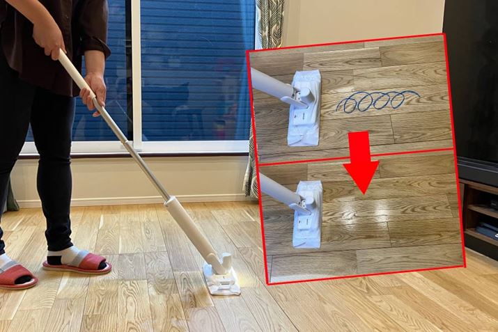 1つ目は、市販の床拭きウェットシートをヘッド部分に装着して、床掃除ができるところです。使い捨ての床拭きシートを使用できるので、準備の面倒くささもなく、掃除の後はシートを捨てるだけでOK。後片付けを気にせず気軽に掃除ができるところは、ズボラな人に限らずありがたい仕様と言えます。