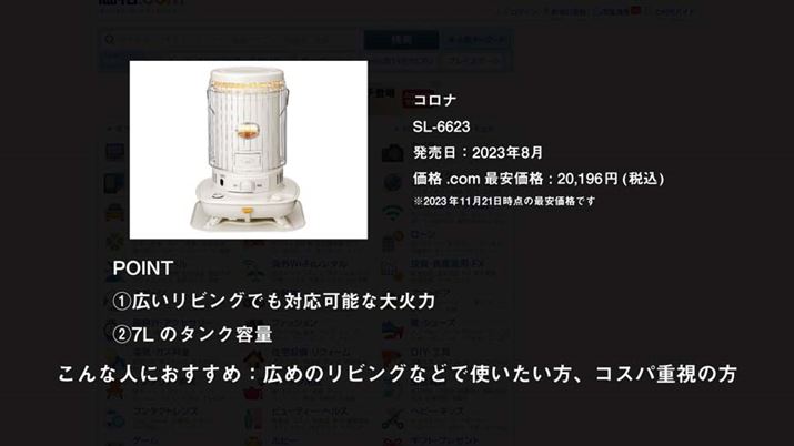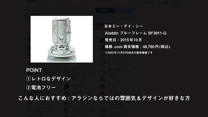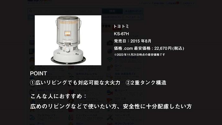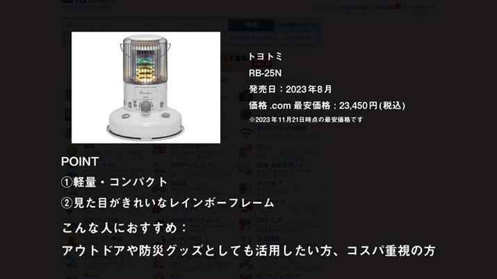 今回は、対流式の石油ストーブから4モデルをピックアップ。製品の詳細は、動画にて詳しく解説していますので、そちらもチェックしてください。