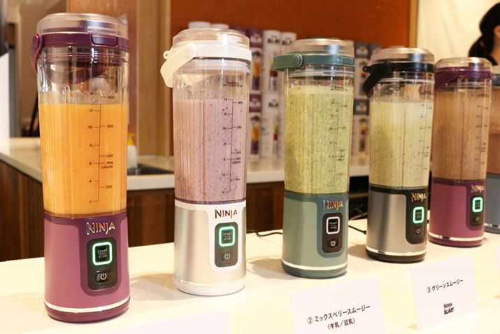 まだ製品を見る前、配布された資料を見ている段階では「ミキサーか……」と少しテンション低めだったのですが(成熟したジャンルで、驚くほどの新機能はあまり期待できないため)、製品を覆っていた布が取られ「Ninja Blast コードレスミキサー」が登場すると、「なんか、いいかも」と期待値がアップ。