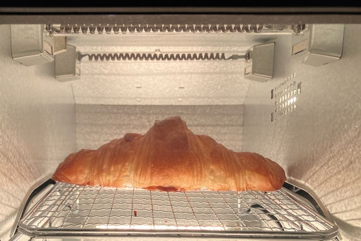 うまく焼けるかな……と思いながら、待つこと約4分。まずいちばん驚いたのが、リベイク前とリベイク後でほとんどクロワッサンの色味が変わっていないこと。焦げていないどころが、色が変わっていません。