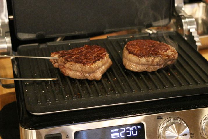 予熱が完了したら塩を振ったステーキ肉を載せ、上プレートを閉じます。ちなみに、厚みのある肉は、側面をたこ糸で縛ると型崩れしにくくなるそう。このくらいの肉なら4分くらいで焼き上がるとのことですが、今回はステーキの両面にクロスして焼き目を付けたいので、まず2分強加熱します