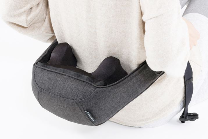 まず、背負ってみた感想ですが、数字(約1.3kg)よりも軽く感じました。バックルを背中側で留め、しっかりとホールドさせるため、歩いたり動いたりしてもズレにくく、“ながら”で本当に使える! とプチ感激。大きく張り出したもみ玉とアームが首・肩を挟み込むような形になるため、フィット感もしっかりとありました。