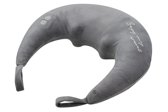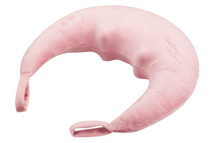 最後に紹介するのは、2016年の発売からロングヒットが続いている「ホットネックマッサージピロー」の3代目。マッサージ器に見えないかわいらしい三日月型のデザインが特徴です。