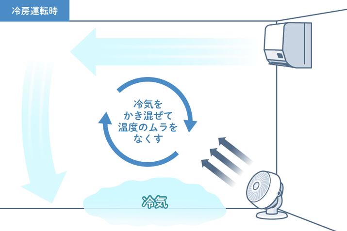 暖かい空気は天井に向かって上昇しやすく、冷たい空気は床に下りてくるため、暖房時は風向を下向きに、冷房時は水平にすると、効率よく冷暖房できます。画像のように冷房、暖房どちらの場合も、扇風機やサーキュレータを併用するとより効果的。天井や床にたまった暖気や冷気を循環させることができます。なお、サーキュレーターを使用した冷暖房の効率化については、以下の記事で詳しく解説しています。