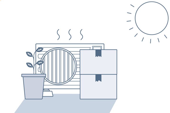 室外機は、冷媒を使って室内の熱を屋外へ逃がし、冷気を作る重要な役割を担っています。室外機の空気がうまく流れないと、冷房効果は約17%、暖房効果は約25%下がると言われています(※)。また、室外機が高温になると消費電力が増えます。室外機は風通しのよい場所に設置し、日陰を作るなどして直射日光から守ると、節電効果が上がります。