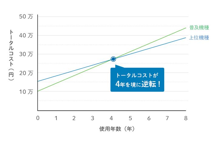 ダイキン14畳のエアコン2機種(普及機種と上位機種)は、本体価が約5万円違いますが、ランニングコストの差で約4年後にはトータルコストが逆転します。