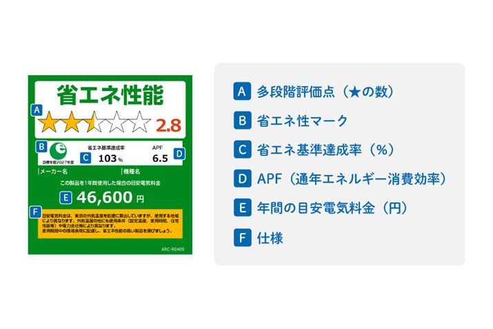 省エネ法では、家電などの省エネ基準を定めています(トップランナー制度)。「統一省エネラベル」は、製品の省エネルギー性能をわかりやすくラベルで表示したもの。エアコンの省エネ性能を示す「統一省エネラベル」は、製品の省エネルギー性能を多段階評価点と星の数で表しています。また、「省エネルギーラベル」と、東京の外気温度を前提に算出した「年間の目安電気料金」、エアコン燃費を示す「APF(通年エネルギー消費効率)」なども表示されています。
