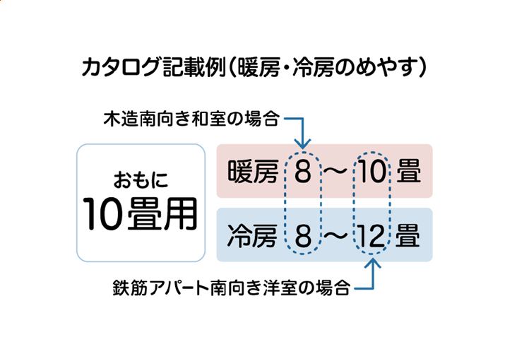メーカーサイトやカタログなどに記載の最小値は木造(南向き・和室)の場合、最大値は鉄筋アパート(南向き・洋室)の場合の適応畳数を示しています。画像の場合、暖房時は木造なら8畳、鉄筋なら10畳、冷房時は木造なら8畳、鉄筋なら12畳の部屋に向いていることを表しています。暖房時の「8〜10畳」は、8〜10畳の部屋に適応するという意味ではないので注意しましょう。