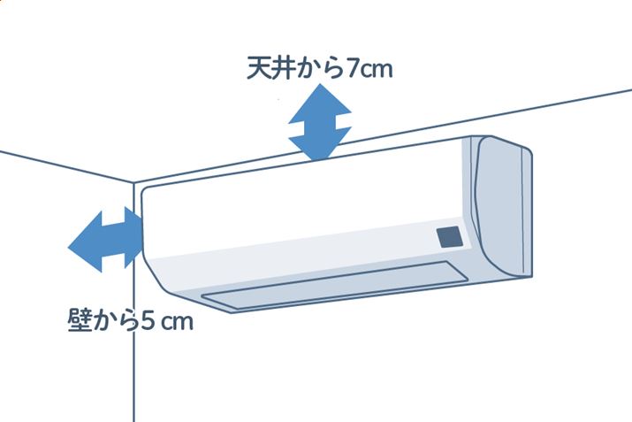 室内機を設置するには、天井まで7cm以上、左右は5cm以上、下はおおむね10cm程度のスペースが必要です。このスペースを確保したうえで、それに合ったサイズの製品を選ぶようにしましょう。