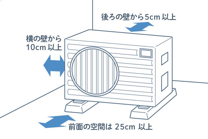 室外機の設置では、前方25cm以上、後方5cm以上、左右10cm(配管を受ける側は30cm)以上のスペースが必要です。購入前に、このスペースが確保できるかを確認しておきましょう。