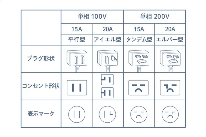 エアコン専用のコンセントは100V用(15A、20A)と200V用(15A、20A)など4種類あります。プラグの形状も異なるので、設置する部屋のコンセントの形状を必ず確認しておきましょう。