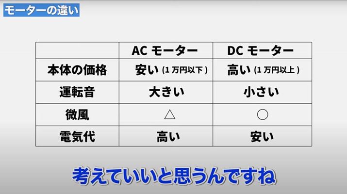 いっぽうの、DCモーター(直流式モーター)は、ここ10年くらいで採用されることが増えてきたモーター。このモーターの特徴はトルクが太くパワーがあるため、羽をゆっくりと回転させられる、つまり微風が作りやすいという特徴があります。また、運転音が小さい、電気代が安いというメリットもあります。ただし、価格はACモーターよりも高価になってしまいます。