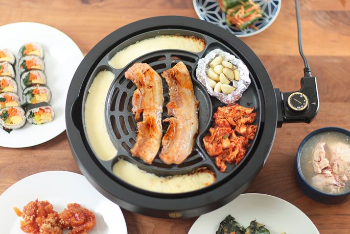 「グリルマイスター」のサイズは345(幅)×340(奧行)×90(高さ)mmと、比較的コンパクト。ひとり暮らしの家にあるそれほど大きくない机に置いても、サンチュやナムル、キンパ、スープ、タレなど、いろいろな小鉢や小皿も並べられるでしょう
