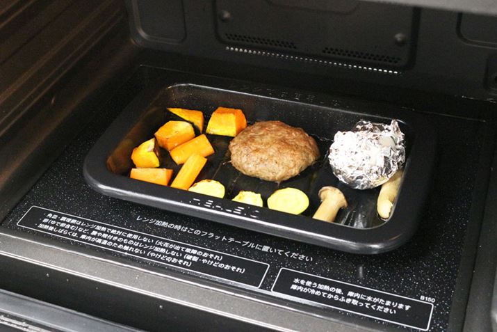 「らくグリ!調理」も過熱水蒸気で調理します。「ヘルシオトレー」の底四隅に突起を設け、庫内に直接置いても過熱水蒸気が下に回るように工夫。トレーを包み込むように過熱水蒸気が循環し、食材の中心部までしっかり加熱します