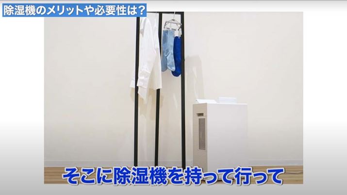もうひとつのメリットは、エアコンのように固定で設置されていないため、部屋のどこにでも持って行って使える点です。特に、部屋干しのために除湿したいのであれば、衣類の近くに設置できる除湿機のほうが使いやすいと言えます。