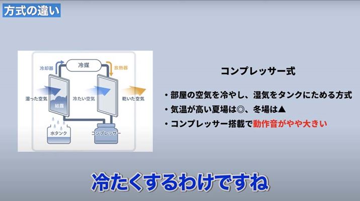 方式の詳しい説明は動画をご覧いただきたいのですが、コンプレッサー式は部屋を涼しくするため、夏は快適なものの、冬に使うのは難しい方式です。また、コンプレッサーを搭載するため、動作音が大きくなります。