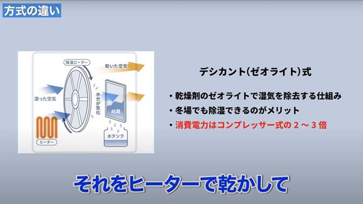デシカント式は、ヒーターを搭載するため夏に使うのが難しく、冬に使える方式です。また、消費電力がコンプレッサー式の2〜3倍かかります。