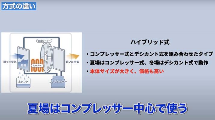 「コンプレッサー式を買っても冬に使いづらい、デシカント式にすると夏に使いづらい」ということになります。これを解決してくれるのが、ハイブリッド式です。コンプレッサー式とデシカント式のそれぞれが不得意とするところをカバーして運転するため、1年中とおして使えるという大きなメリットがあります。その反面、本体が大きくなり、価格も高くなります。