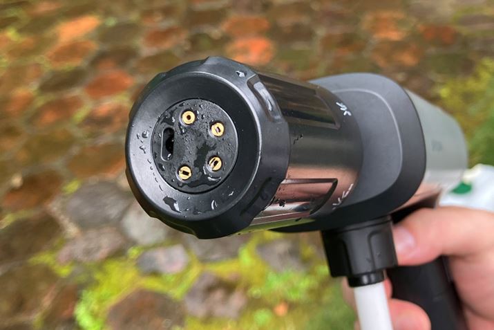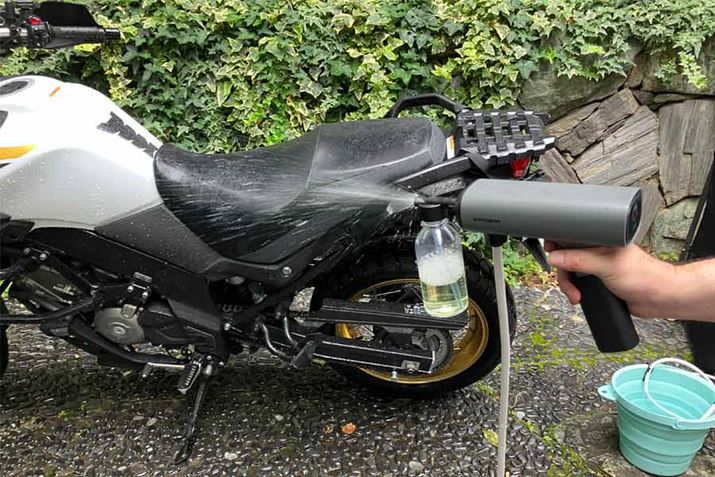 1点だけ留意していただきたい点があるとすれば、それは吐出圧力です。一般的なバッテリータイプの高圧洗浄機の吐出圧力は最大2MPaクラスの製品も多いですが、本機の吐出圧力は最大で1MPaとなっております。これは精密パーツが露出したバイクを洗浄するためで、意図的にやや控えめな圧力に設計されていますので、お気を付けください。