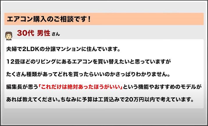 視聴者さんの質問は以下のとおり。12畳のリビングに設置しているエアコンを買い替えたいけども、どれを買えばいいかわからない。工賃込み20万円で購入できるおすすめモデルや、押さえておくべき機能を教えてくださいというものです。