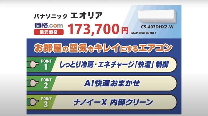 ついに2024年も暑い夏が到来。今回は暑さ対策の鉄板家電、エアコンの特集ということで、視聴者さんからの質問をベースにエアコンの選び方や注目機能について解説。さらには、価格.com編集長の厳選モデルも紹介します。