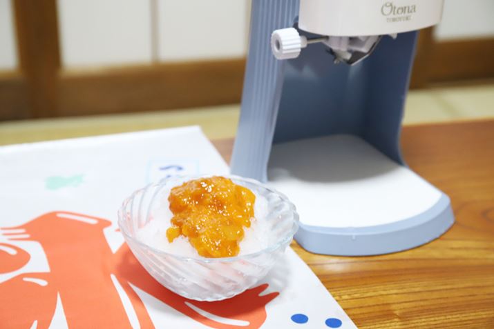 あんずジャムをシロップで溶いて氷にかけた「ふわふわあんず氷」