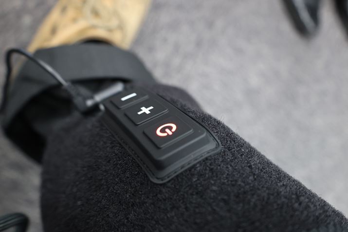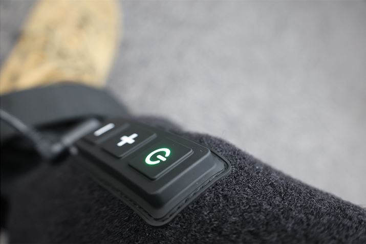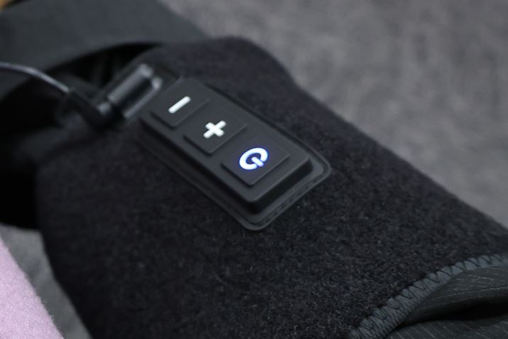 マッサージの強さは3段階。「+」ボタンを押すと、弱(青)/中(緑)/強(赤)に表示が変わる。まずは弱から試してみると、「ああーなるほど」と素直に声が出た。まさに血圧計を着けられている感覚で、結構な圧がかかる。