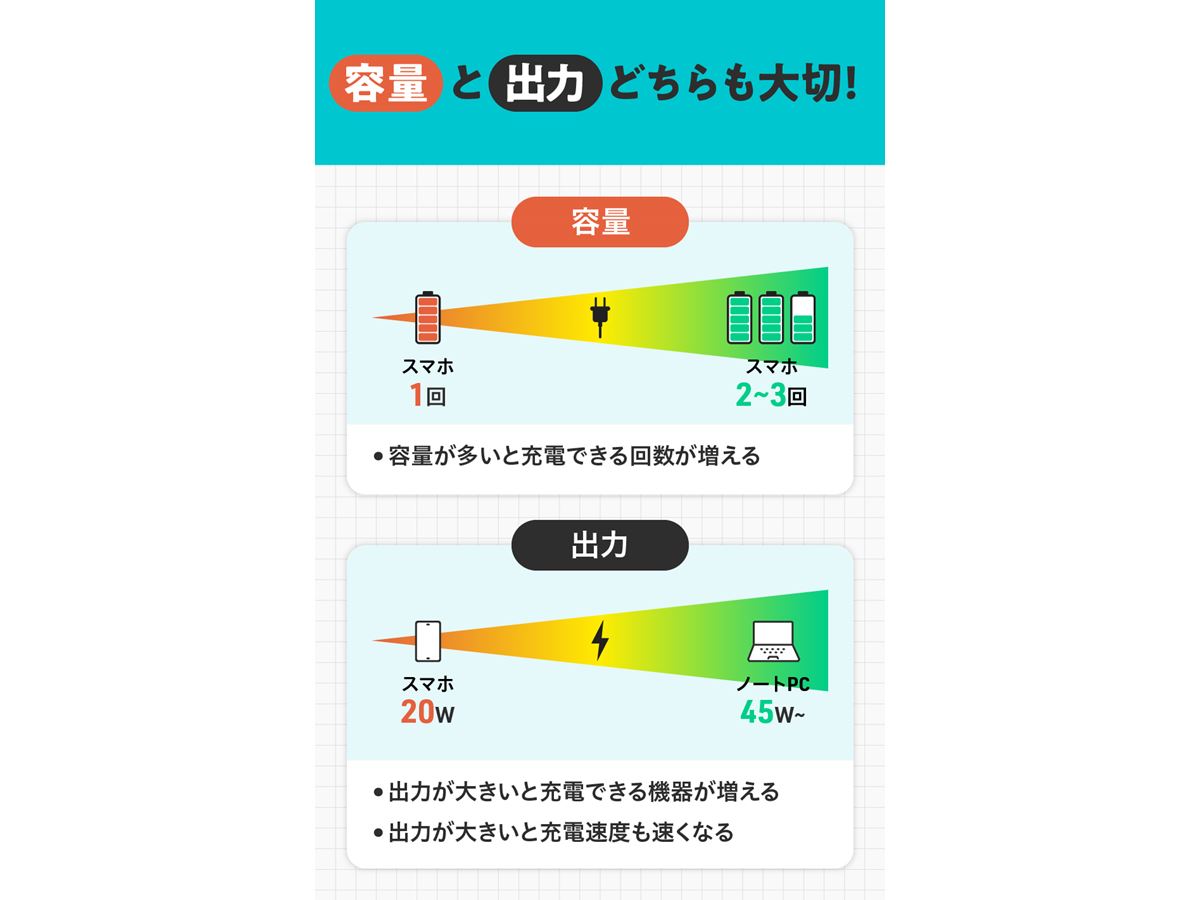 モバイルバッテリーを選ぶうえで、知っておきたい2つのキーワードが容量と出力です。