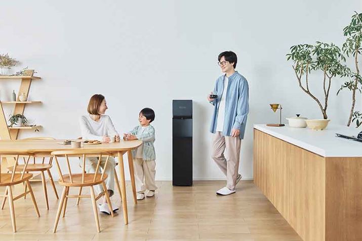家族で使用できるという天然水ウォーターサーバー。天面タッチボタン式で片手で操作できるのが特徴。小さな子どもは天面に手が届かず安心、かつ、フロントパネルに冷水限定の出水ボタンを配置し、自分で水を組める年齢の子どもなら操作が可能。3秒長押しで温水の解除ができるチャイルドロックも搭載する。さらに、通常約80度の温水を、約3分間で90度まで加熱する再加熱にも対応。ボトルは下置きで女性や高齢者でも水を楽に交換できる。水ボトルに直接差し込んで出水できる非常用コックが付属し、備蓄用としても活躍する。