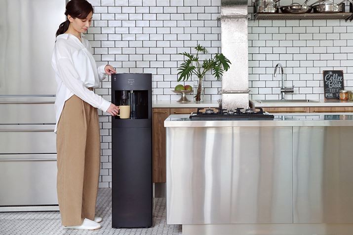ボタンひとつで本格的な「天然水ドリップコーヒー」が飲めるウォーターサーバー。お茶・紅茶にも対応。サーバーのエアレス構造やフレッシュ機能により「天然水をいつでも新鮮な状態を保つ」としています。水は、富士山の標高1000m地点で採水される、希少ミネラル「バナジウム」を含んだ天然水(軟水)。
