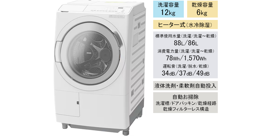 一般的な洗濯容量12kgモデルよりも乾燥容量が7kgと大きく、かつ、ヒートポンプ式ながら公式オンラインストア価格は149,900円。これだけでも高コスパですが、週1回程度の手入れで済む乾燥フィルターの自動おそうじ、液体洗剤・柔軟剤自動投入、温水洗浄、スチームで衣類のシワやニオイを取り除くコースなど人気の高い機能を備えています。速乾性と省エネを両立するために、ヒートポンプ乾燥の立ち上がりを補助するサポートヒーターも搭載。5年保証も付いているので、価格で選んでも満足できそう。