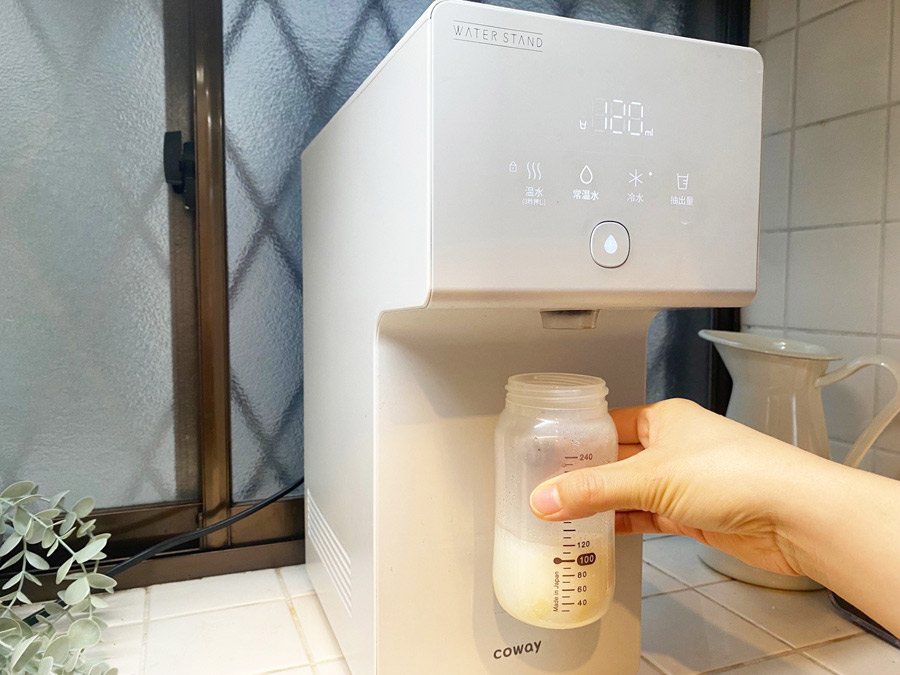 いっぽう、ウォーターサーバーは温水と常温水や冷水がすぐに出るので、赤ちゃんを待たせることなくミルクができます。また、ボトルや内部が密閉構造になっているウォーターサーバーは、外から雑菌やホコリが入りにくく安心です。使い勝手の面では、ほ乳びんを給水口に置いてお湯を入れることができるので片手でも操作可能。電気ケトルのように持ち上げて注ぐ手間を省けます。