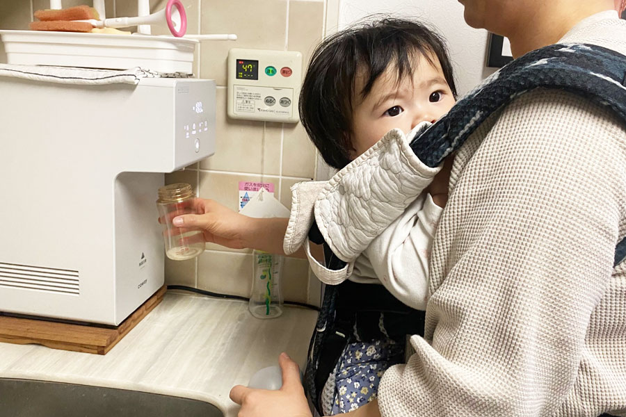 2人目でウォーターサーバーを導入したところ、嘘のようにミルク作りの呪縛から解放開放されました。まず、水自体が安全かつ衛生的でそのまま飲ませられるとのこと。「ナノシリーズ・アイコン」は粉ミルクを溶かせる最低温度70度の温水が出るほか、常温水も出るので、濃いめに溶かした粉ミルクに常温水を混ぜれば、すぐにミルクが完成します。温水と常温水の配合割合を覚えておけば、子どもが泣き出してからものの20秒でミルクを飲ませてあげられるようになりました。このスピード感とノーストレス感は何にも代え難いです。