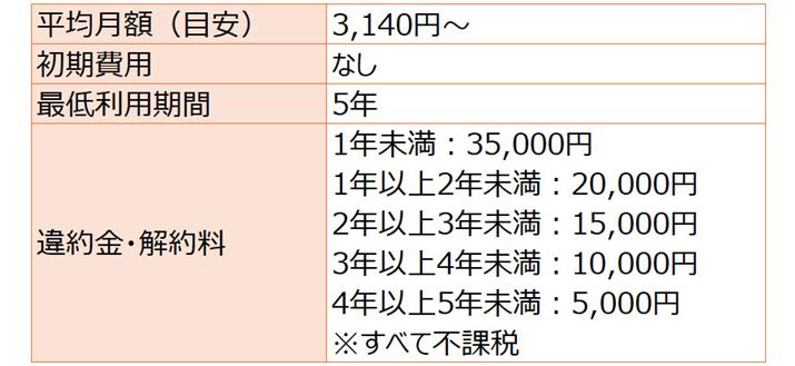 ー | ー | 5年 | 1年未満35,000円/2年未満20,000円/3年未満15,000円/4年未満10,000円/5年未満5,000円 ※すべて不課税 |