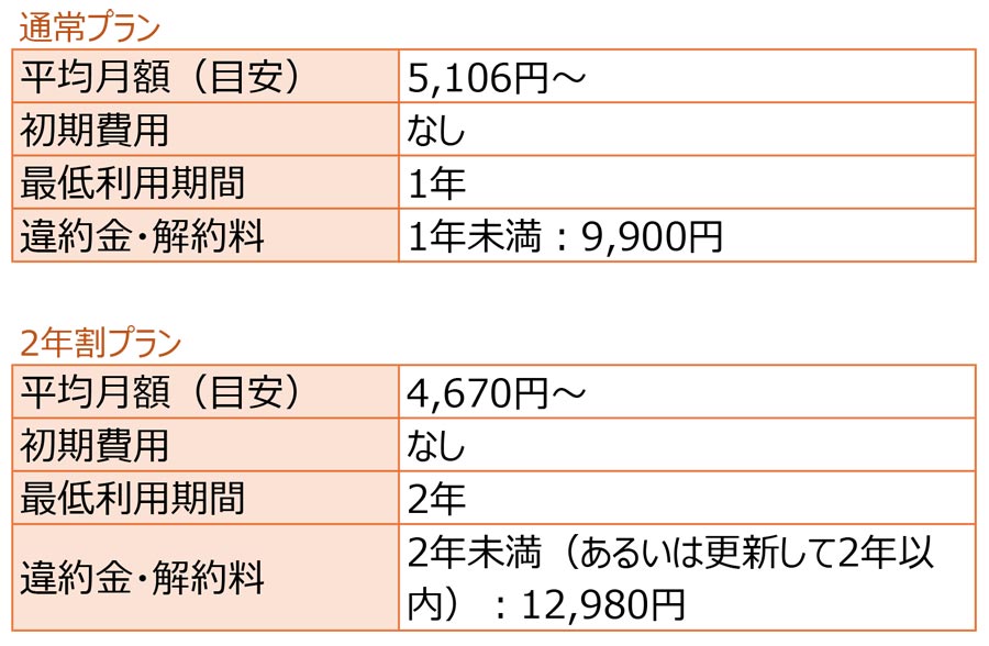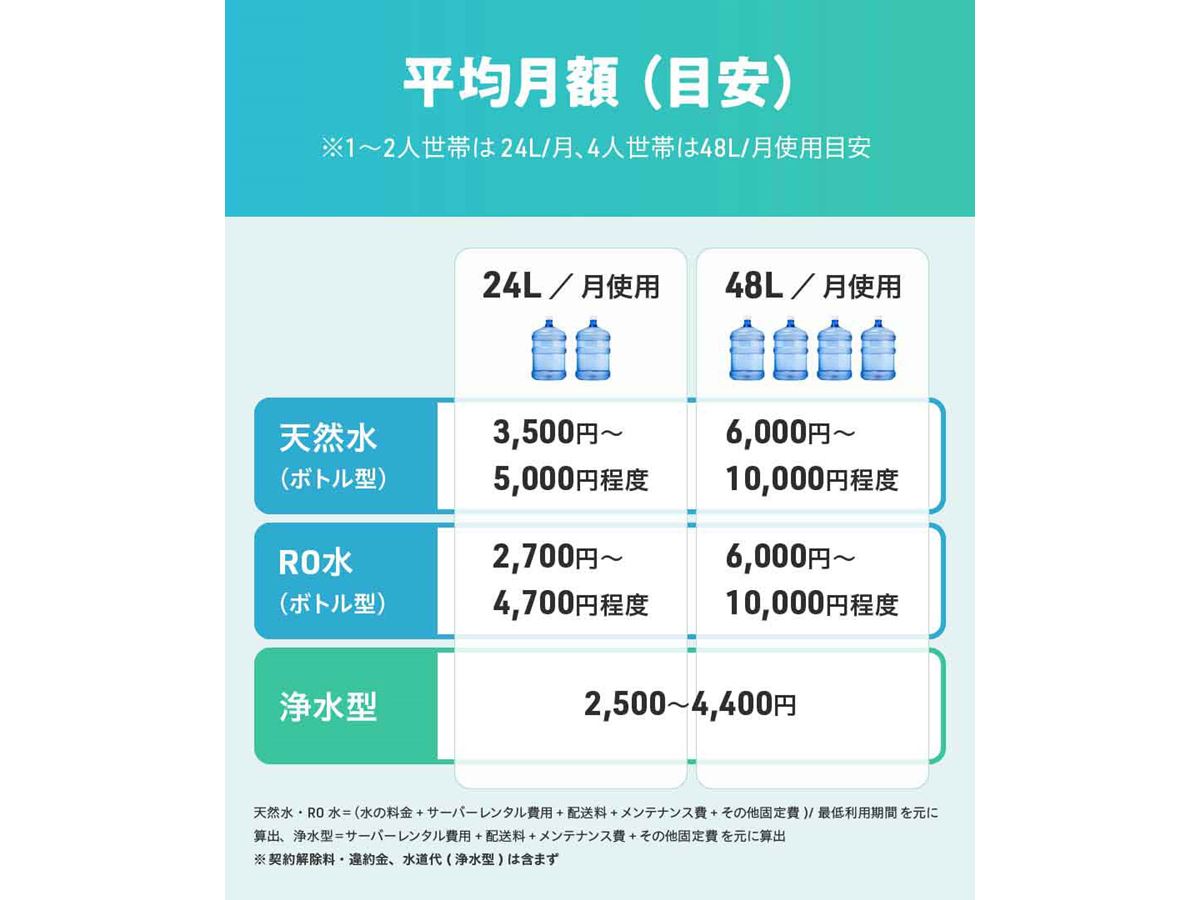 ※平均月額は水の注文量によって変動します(表では月間使用量を2人世帯24Lとして試算)