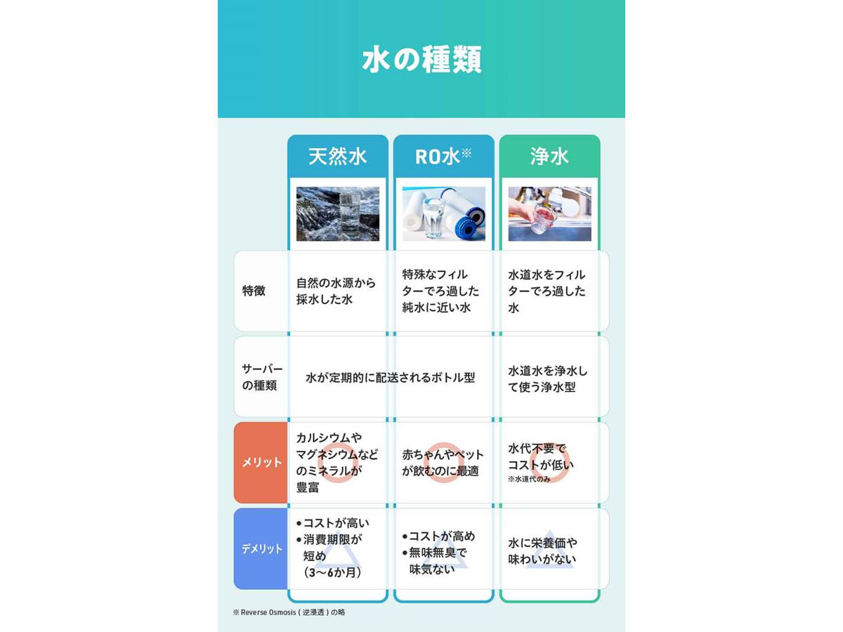 水にはそれぞれメリット・デメリットあり。サーバーごとに対応するお水が決まっています