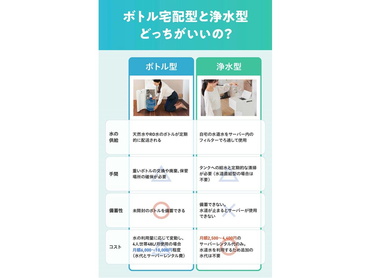 ウォーターサーバーは大きく分けて、天然水などがボトルやパックで宅配されるボトル宅配型と、自宅の水道水を浄化して使う浄水型の2種。ボトル宅配型のお水は主に天然水と、河川水などを特殊なフィルターで浄化したRO水という、純水に近いお水があります。宅配水は5〜12L程度の水ボトルをサーバーへ設置、交換、保管の手間がかかりますが、災害時の備蓄水として活用することもできます。