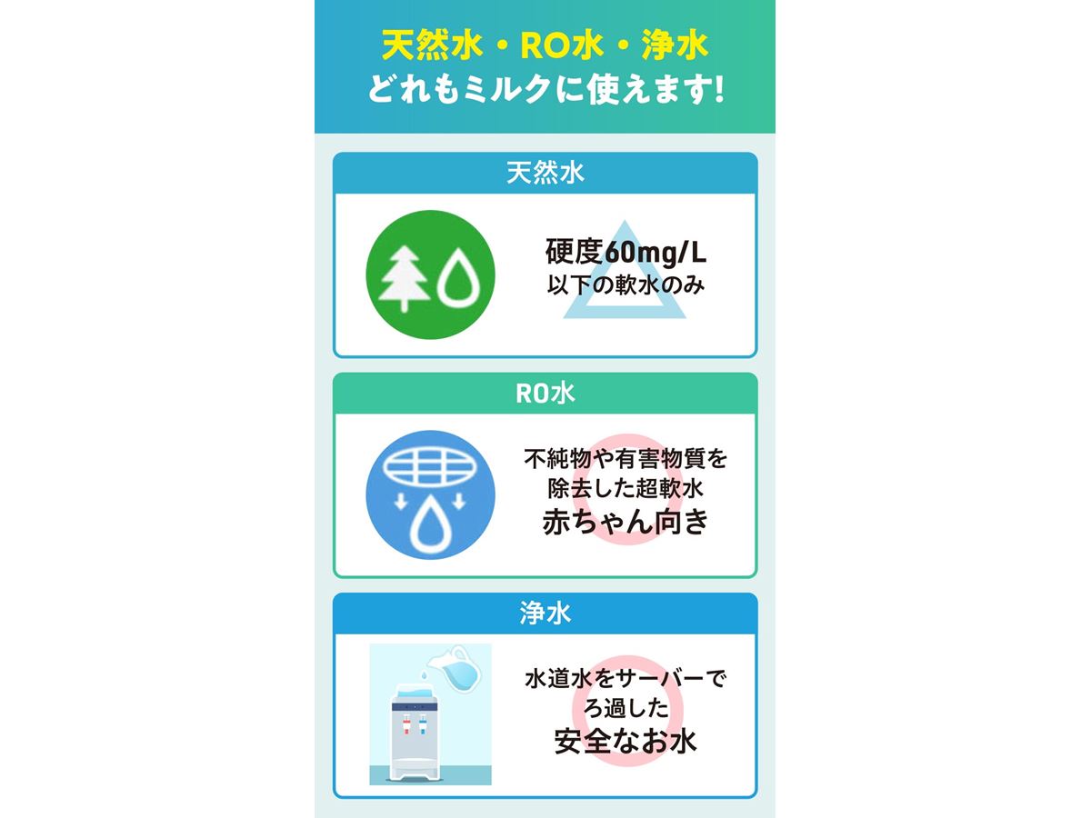 はい。RO水や水道水の浄水、天然水の軟水なら赤ちゃんのミルク作りに安全に使えます。