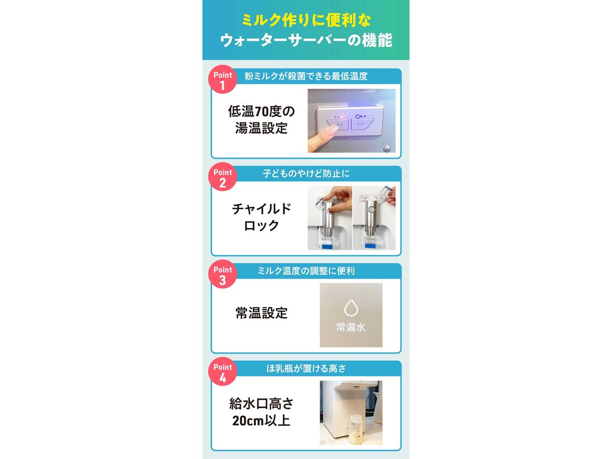 温度設定は、粉ミルクを溶かす際のポイントになります。粉ミルクは完全な無菌でなく、ごく微量ではありますが、 腸炎や髄膜炎の原因となる「クロノバクター・サカザキ菌」や「サルモネラ菌」などの細菌が混入している可能性があり、これらを殺菌するために、70度以上のお湯で粉ミルクを溶かすことが、厚生労働省やWHOのガイドラインで推奨されています(参照:厚生労働省「乳児用調製粉乳の安全な調乳、保存及び取扱いに関するガイドラインについて」)。ウォーターサーバーの多くは温水機能(約80〜90度)を備えているので、粉ミルクを溶かす際は必ず温水機能を使うようにしましょう。