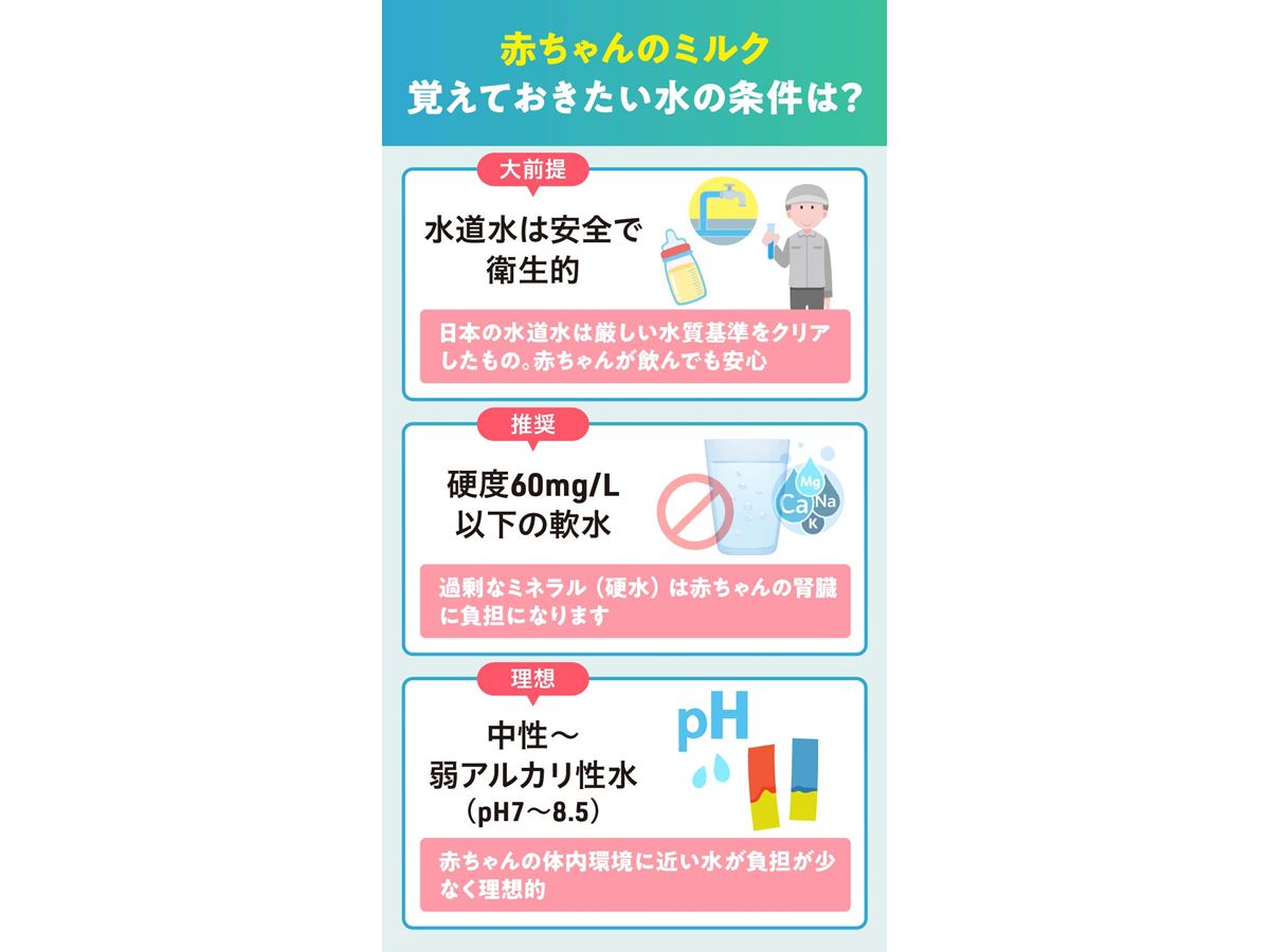 このほか、水の酸性・アルカリ性の度合いpH(ピーエイチ、ペーハー)が、中性付近(pH7〜8.5)の範囲であると、赤ちゃんの体内環境に近いため理想的です。日本の水道水は水質基準でこの範囲に保たれているため、あまり神経質になる必要はありません。